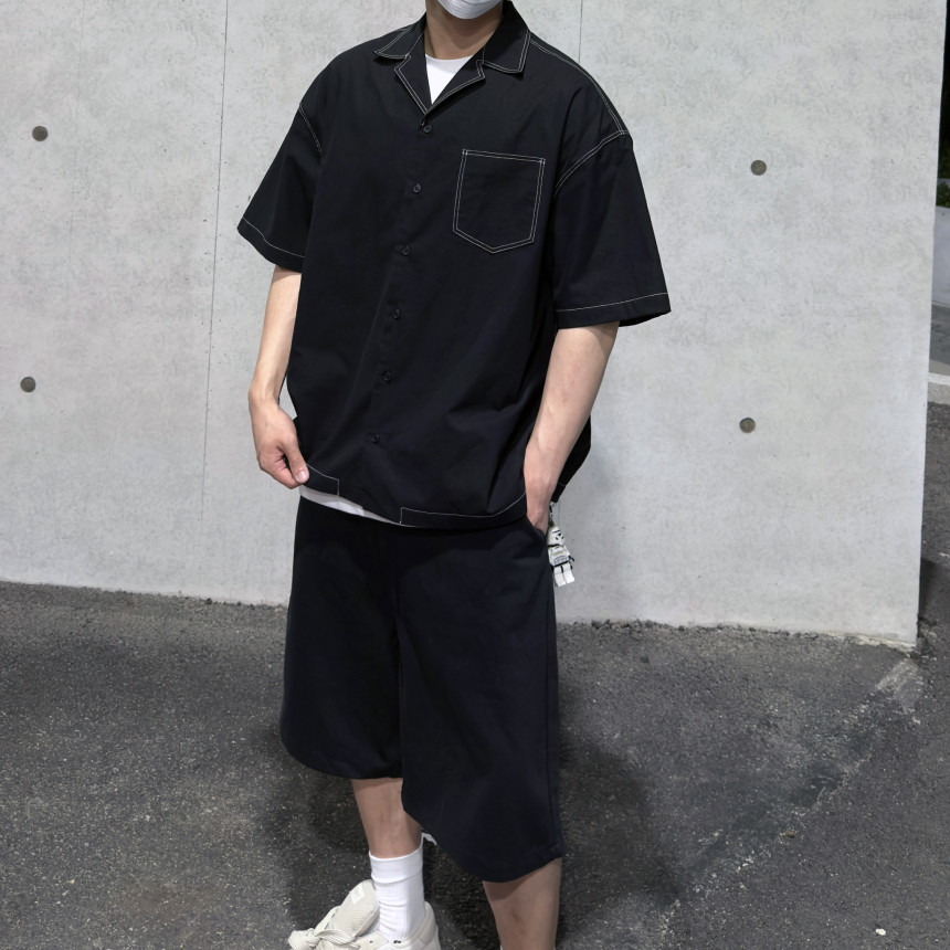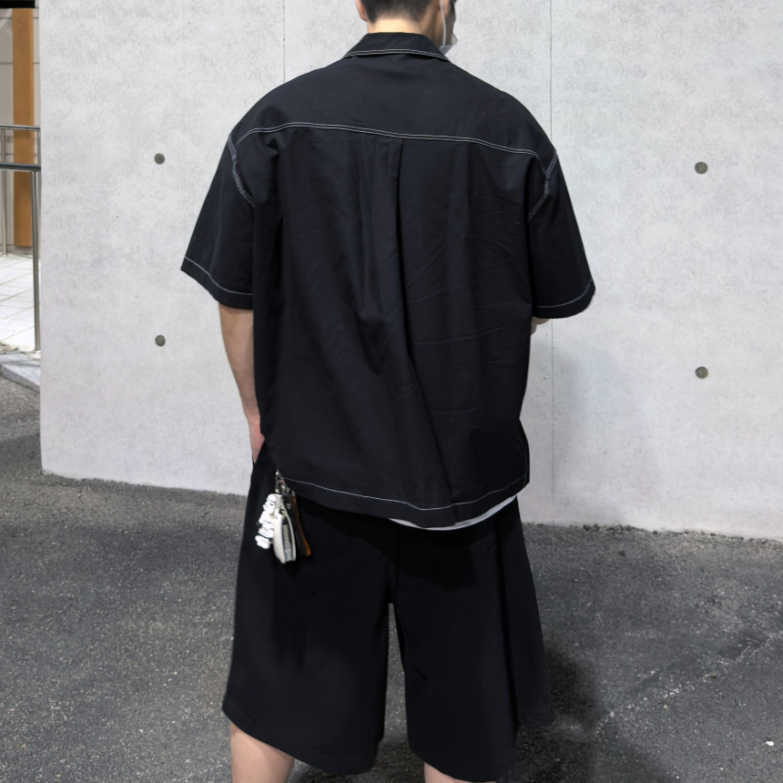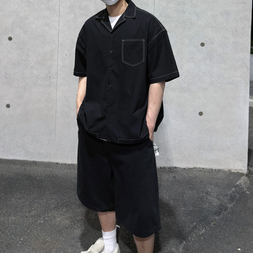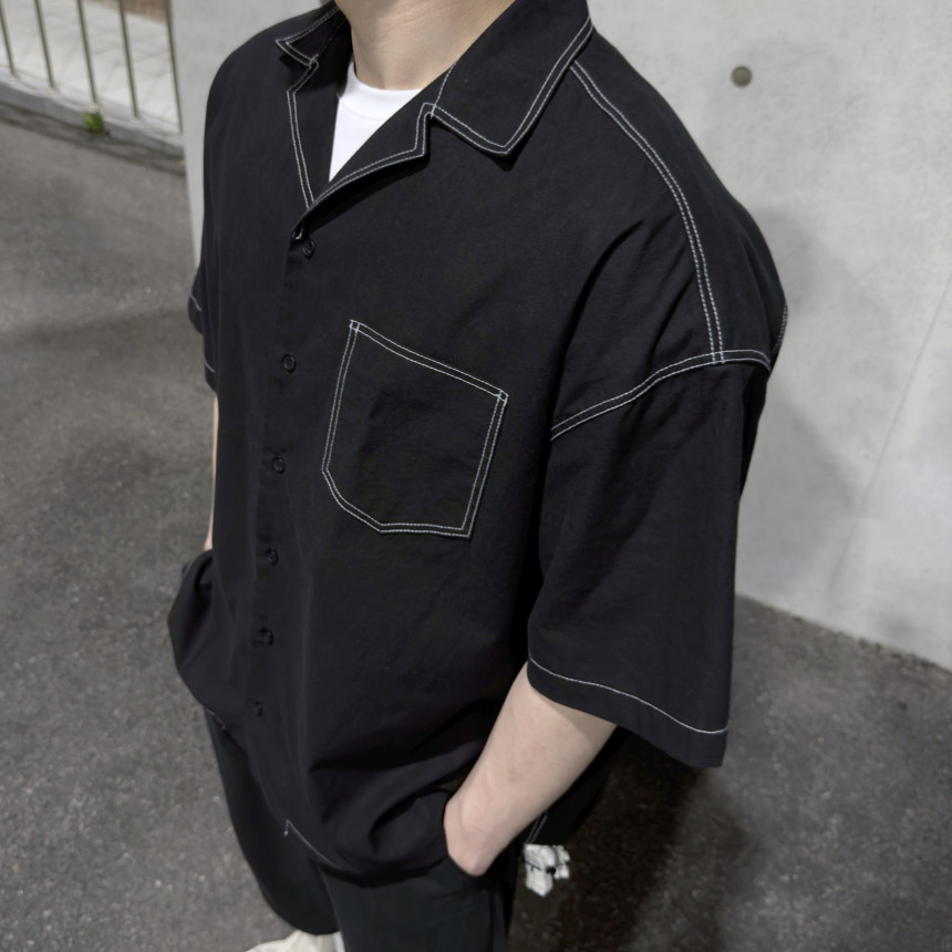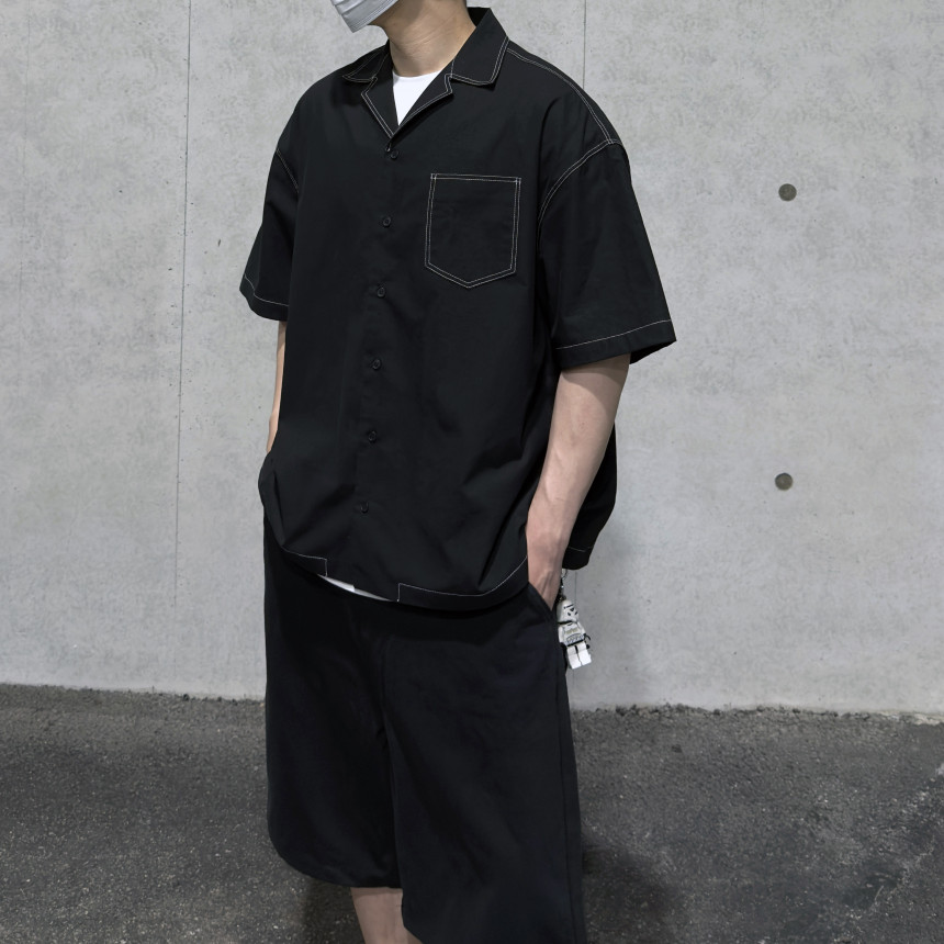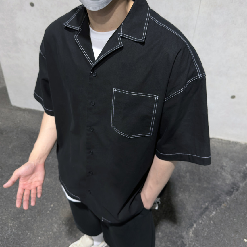 top - stitches open collar shirt (black)