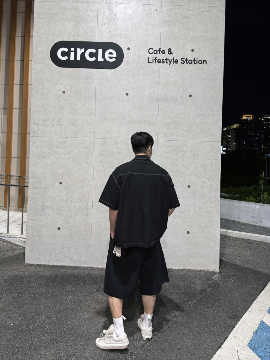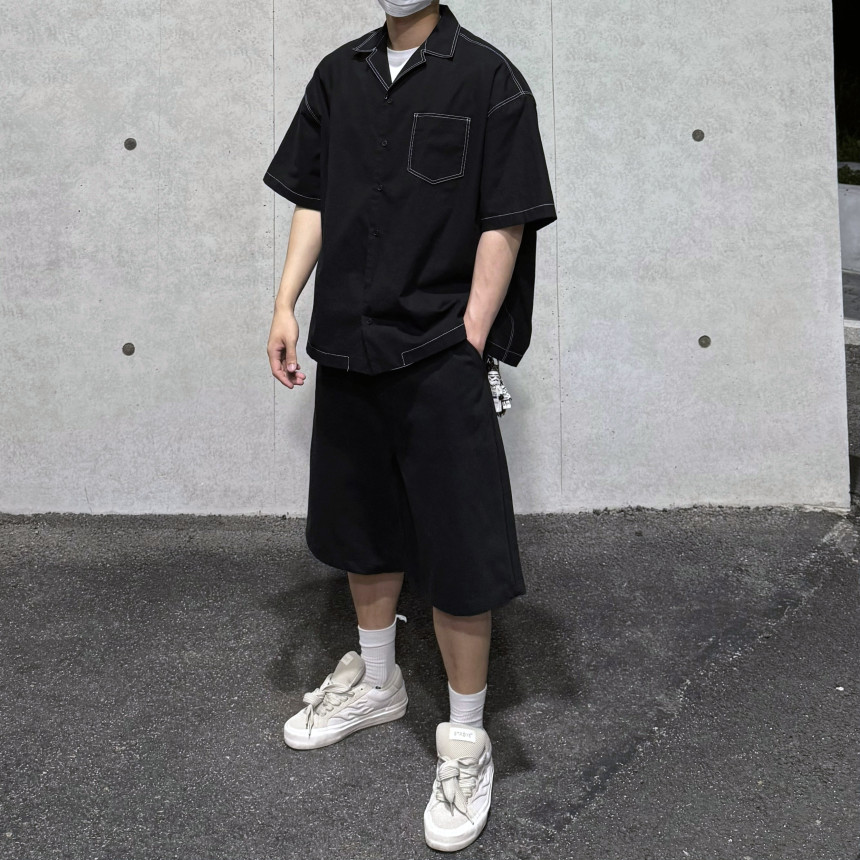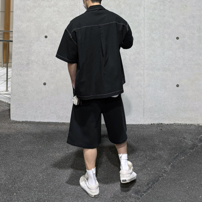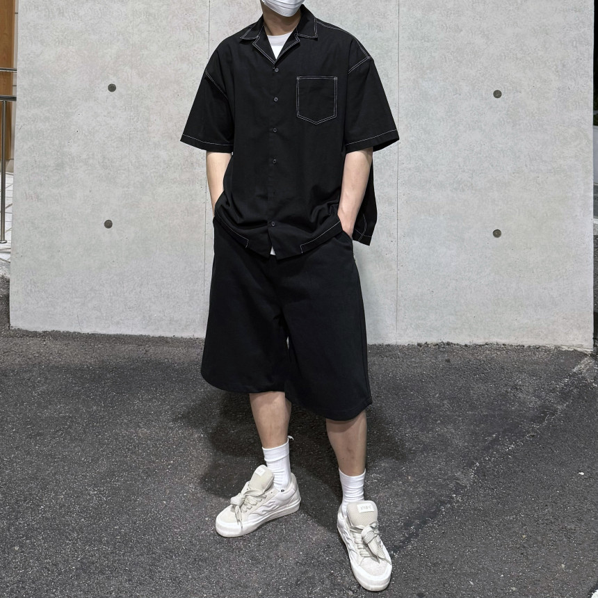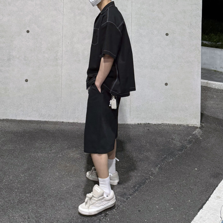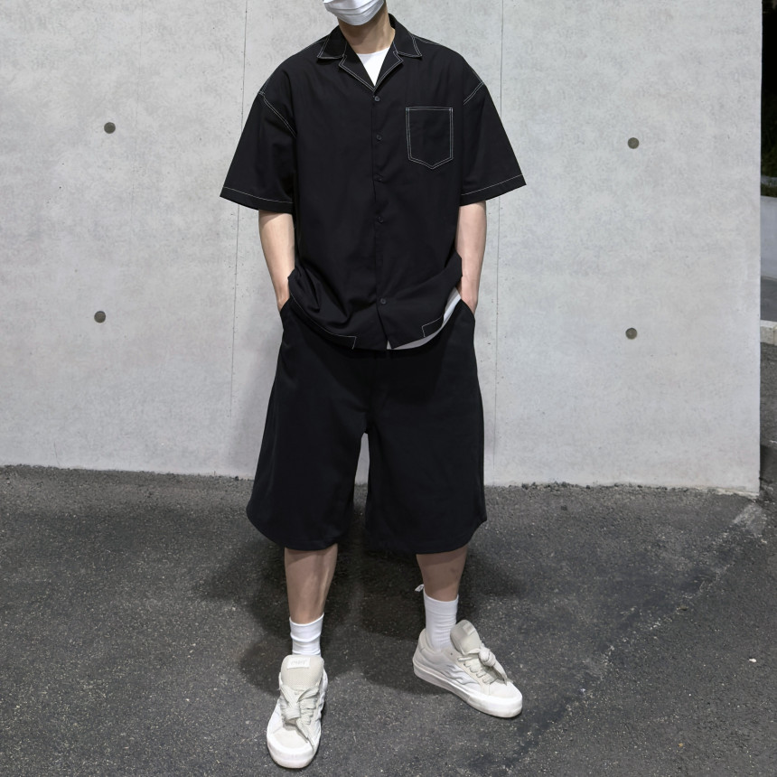 top - stitches open collar shirt (black)