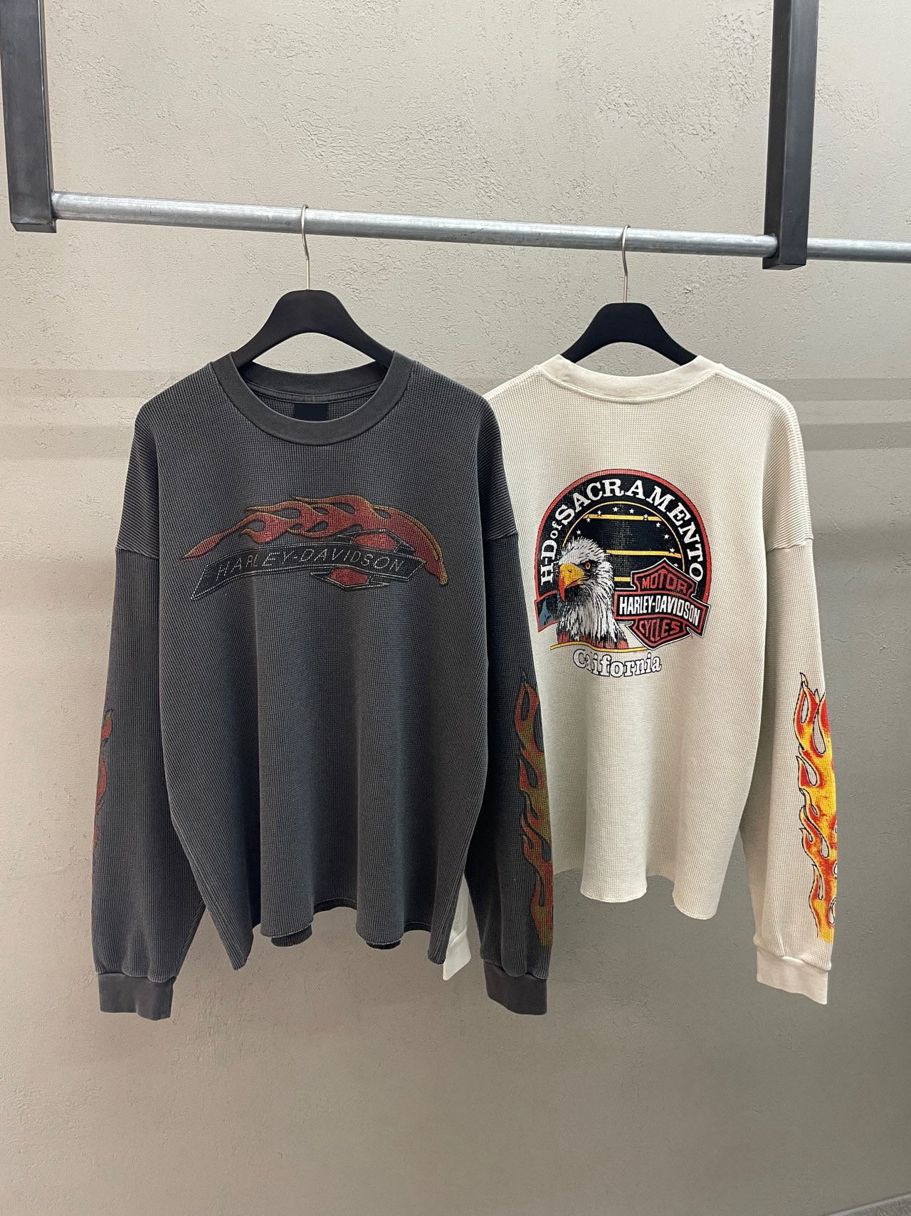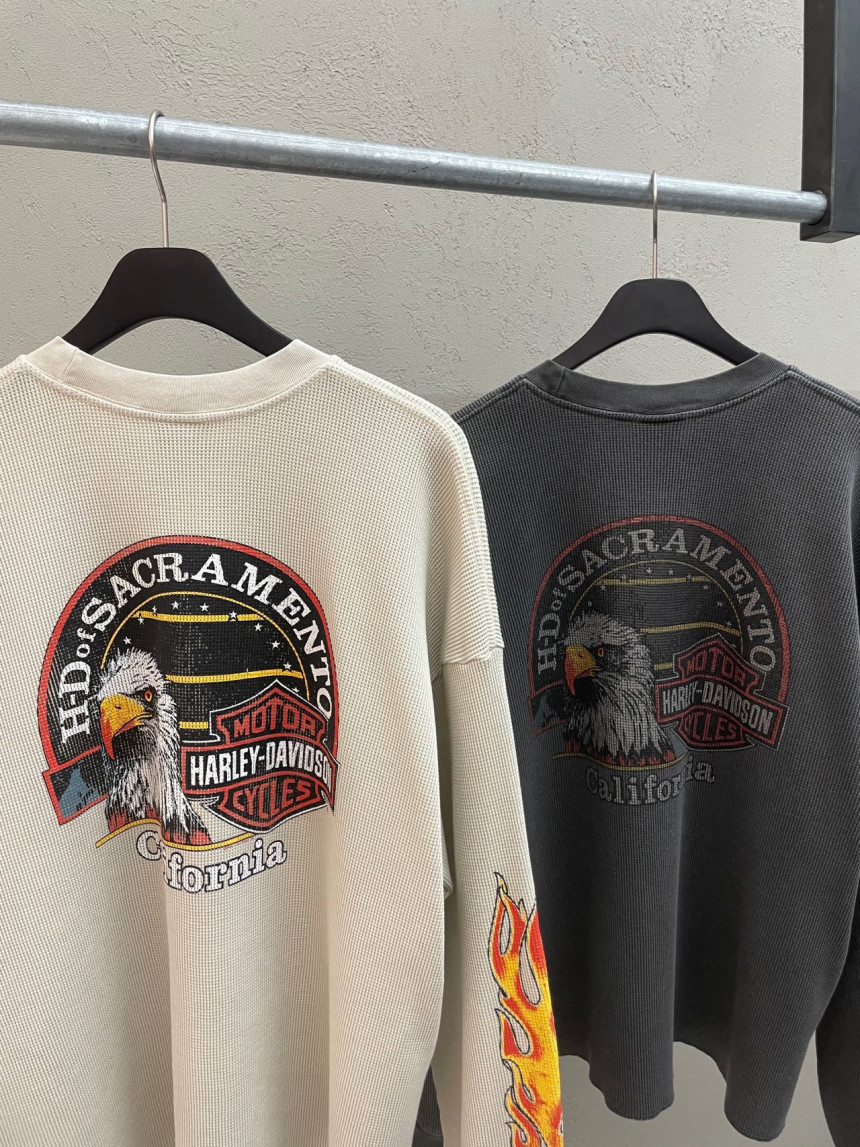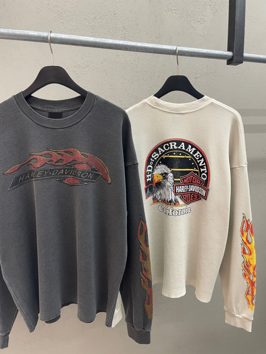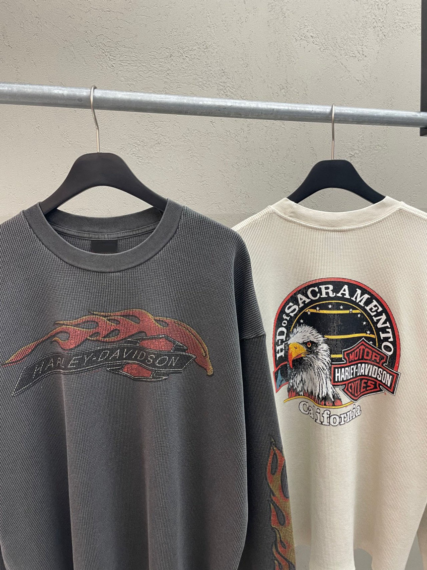 - 세미 크롭한 핏에 와플 소재, 드롭숄더 패턴의 긴팔 티셔츠 입니다.