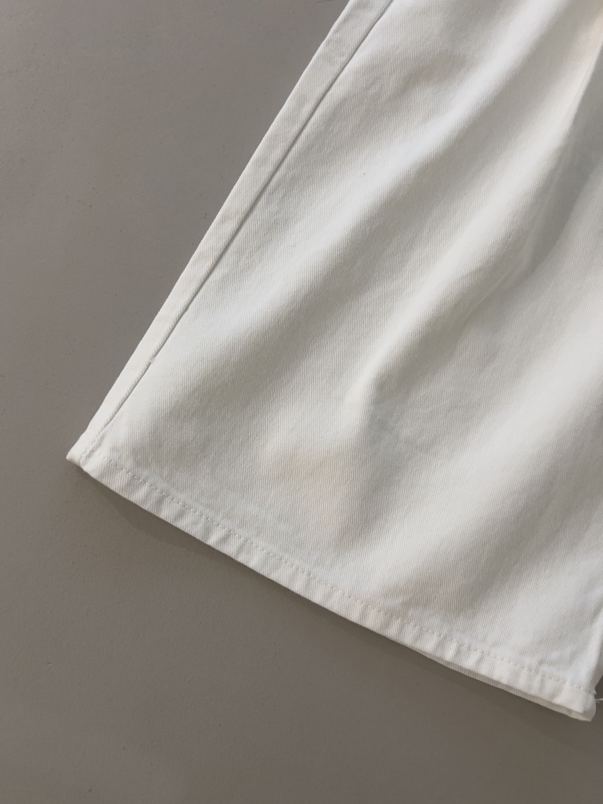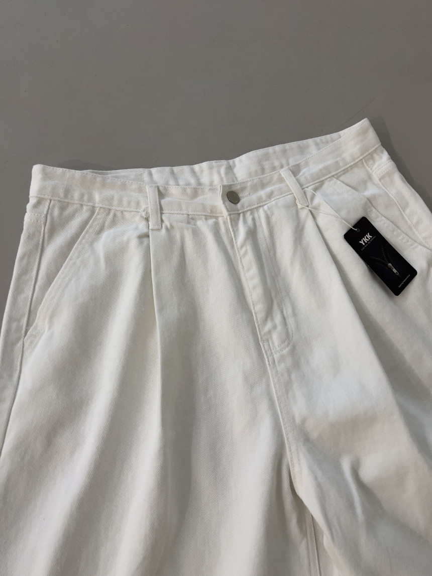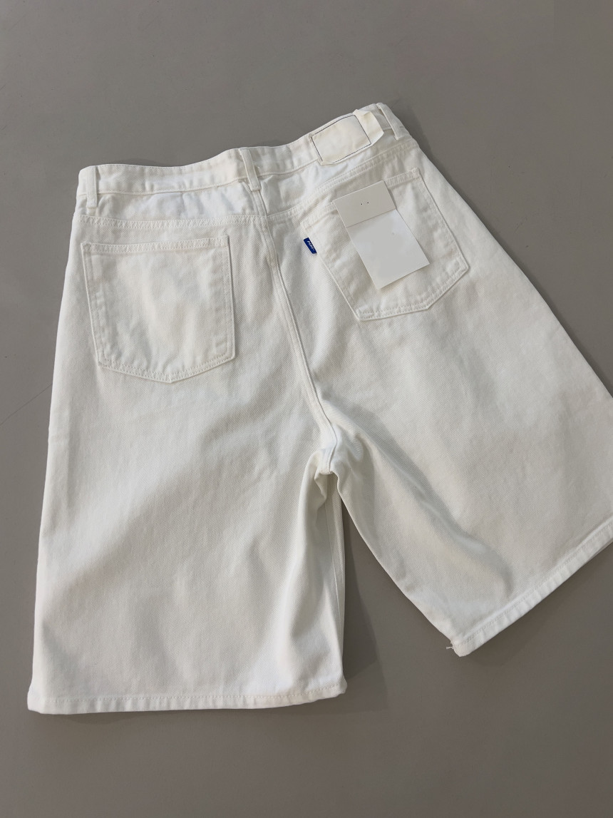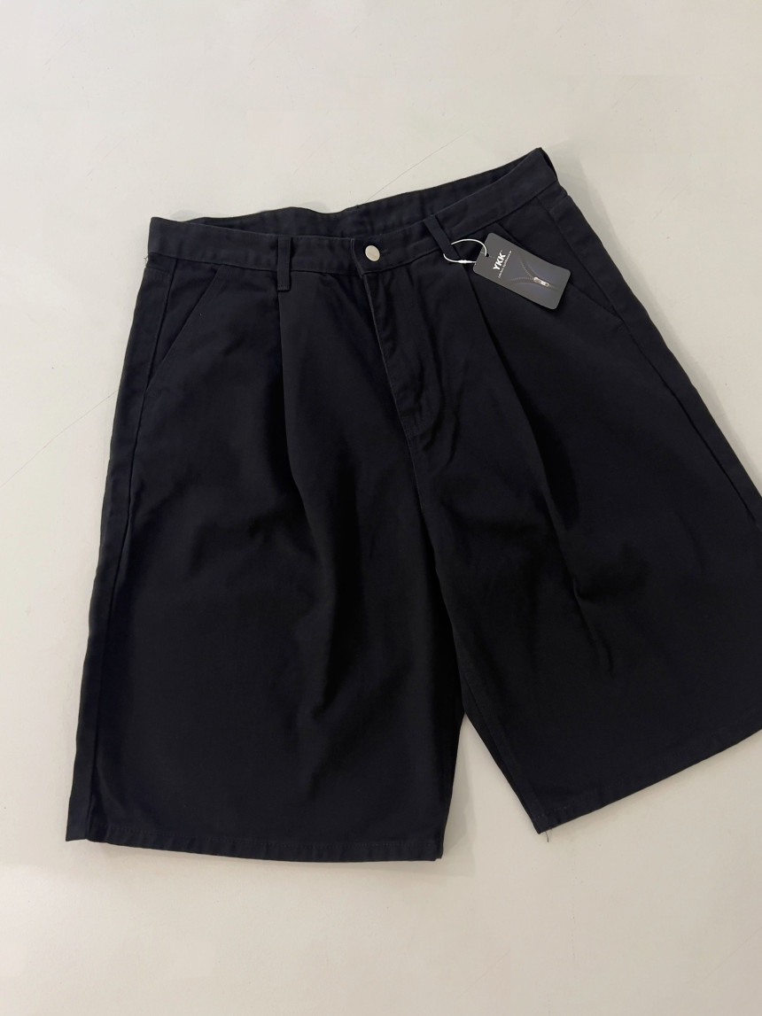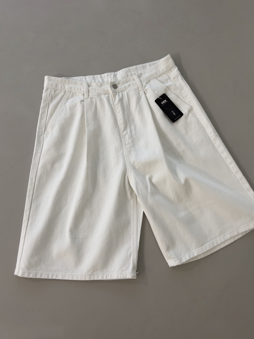 원턱 디테일의 와이드 면 데님 반바지 제품입니다.