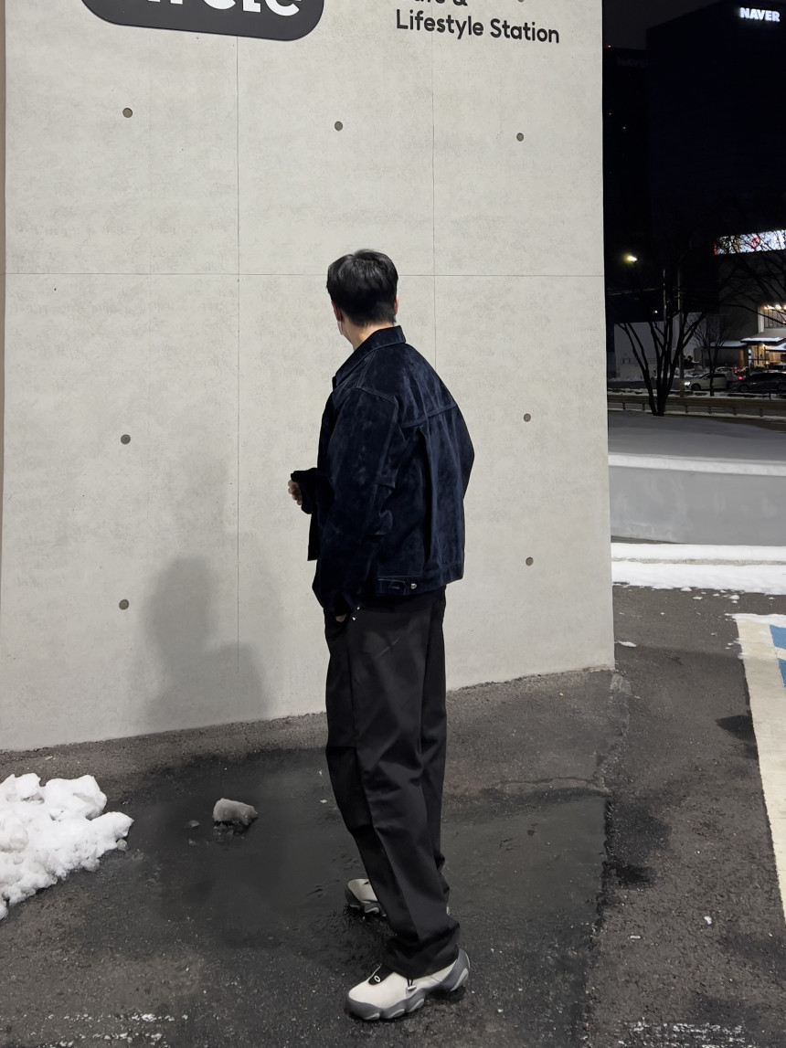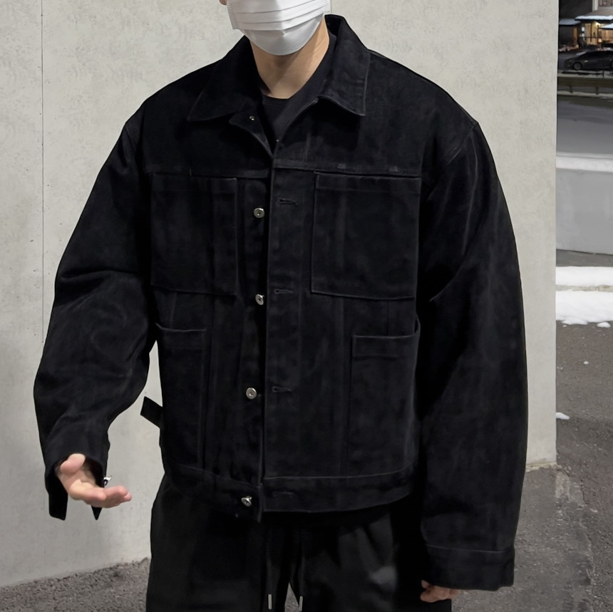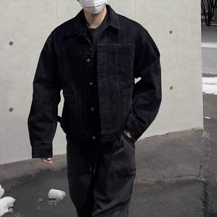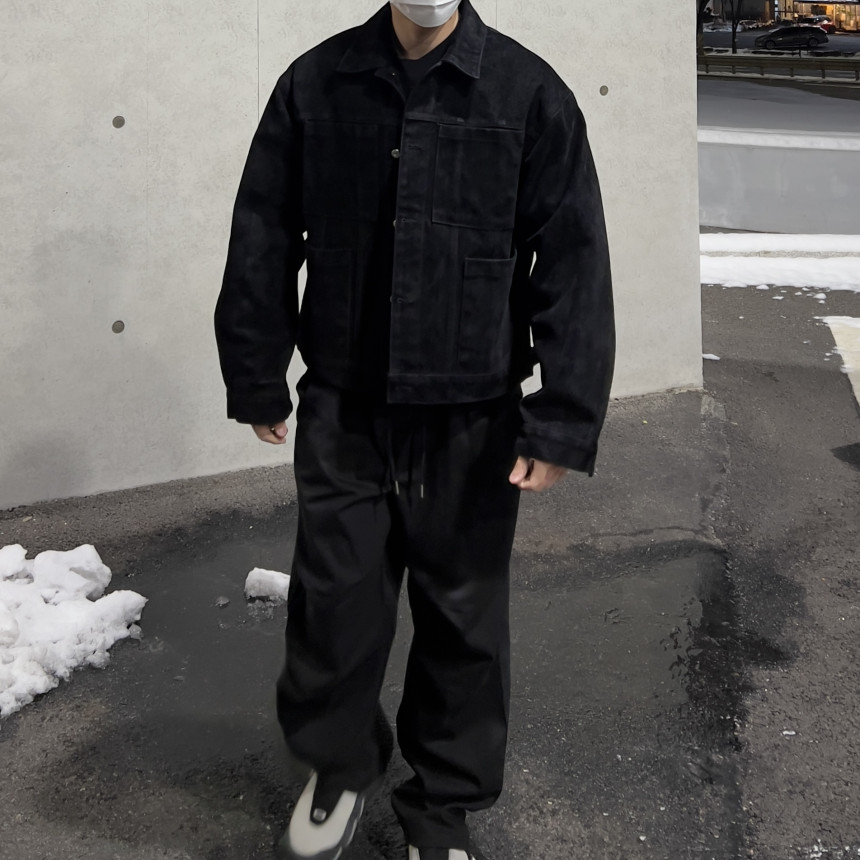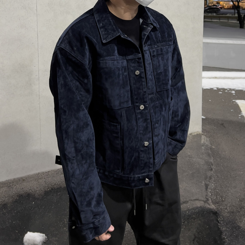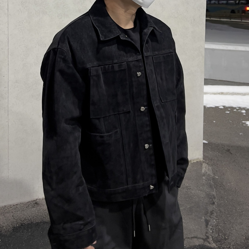 - 크롭 한 기장감, 전면 4포켓의 트러커 디자인 / 팔꿈치 뒤쪽 다트 라인