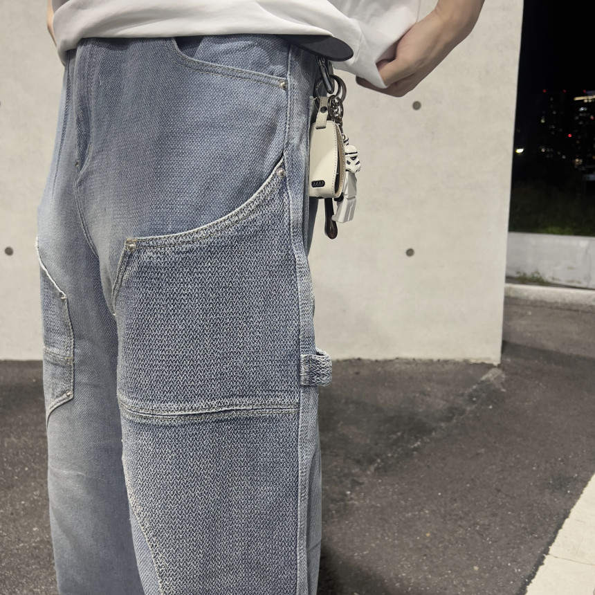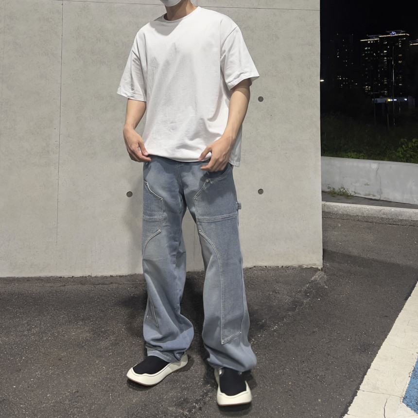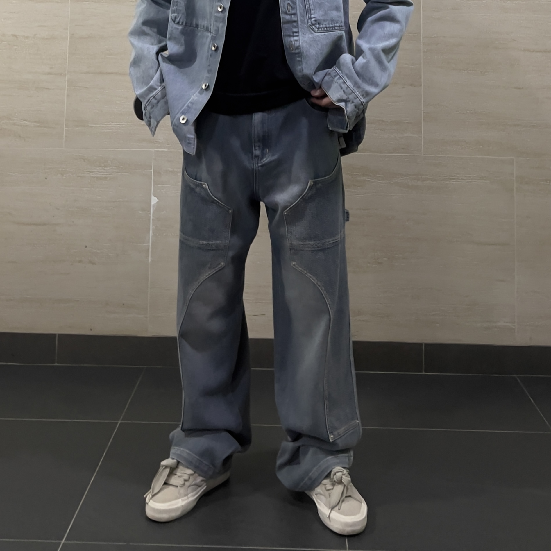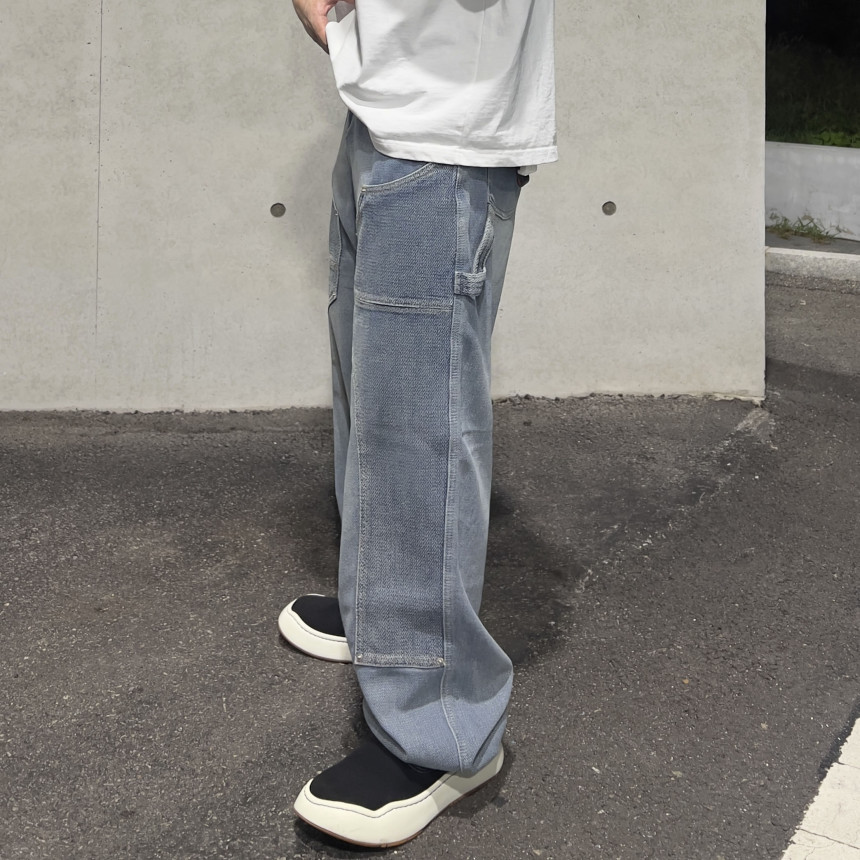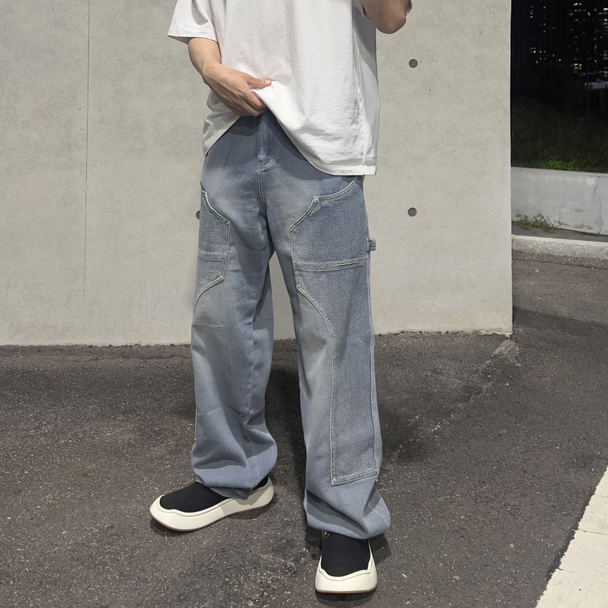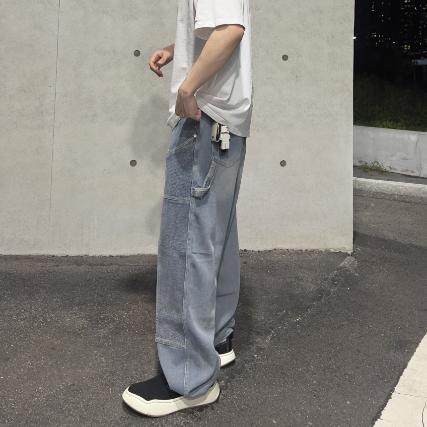 pants - sashiko double knee denim (blue) L 사이즈 착용 M 사이즈도 맞으나 조금 더 여유 있는 핏을 원하여 한 사이즈 업 한 피팅본입니다:)