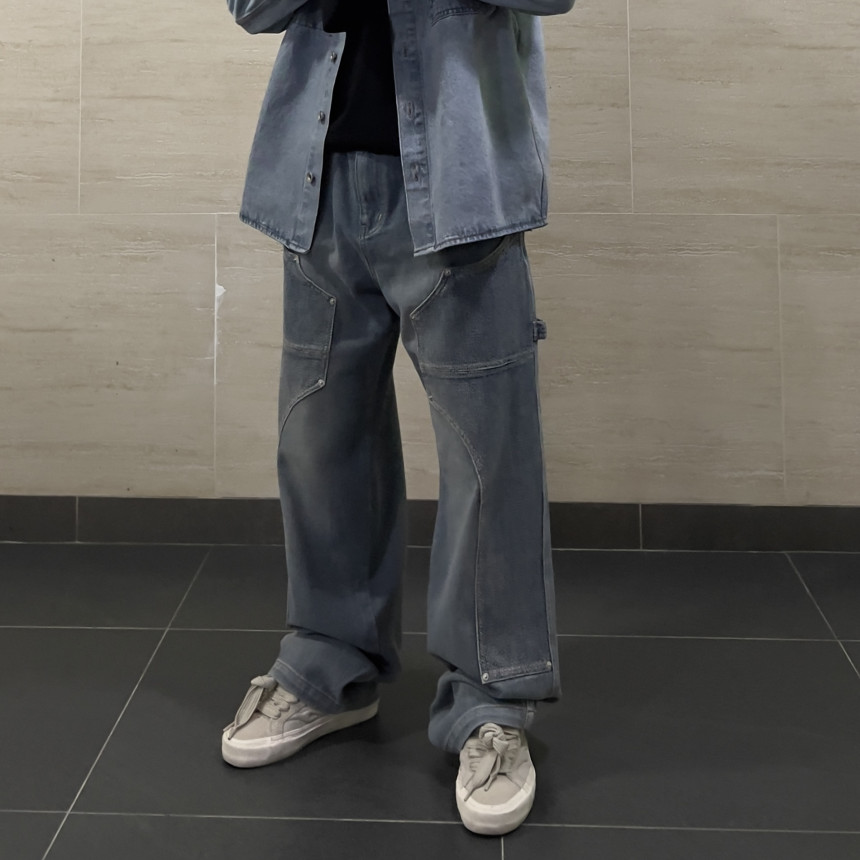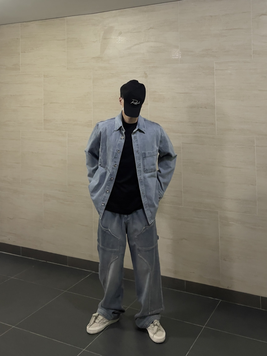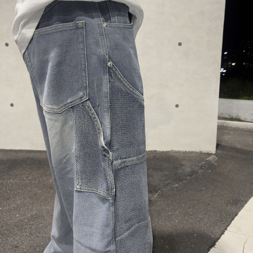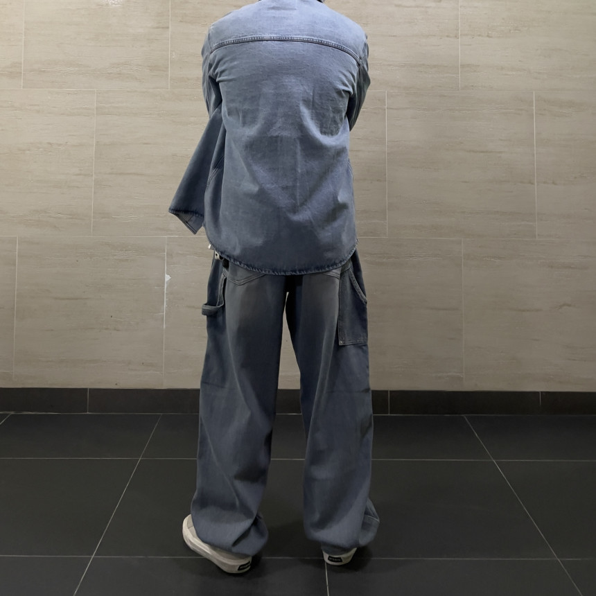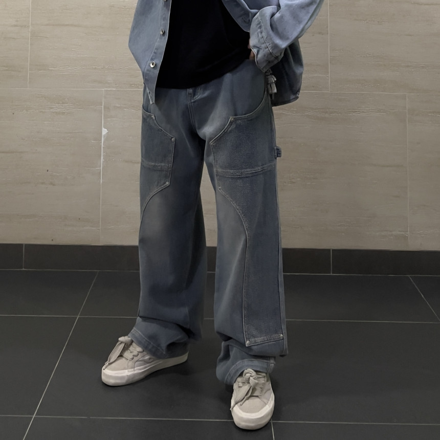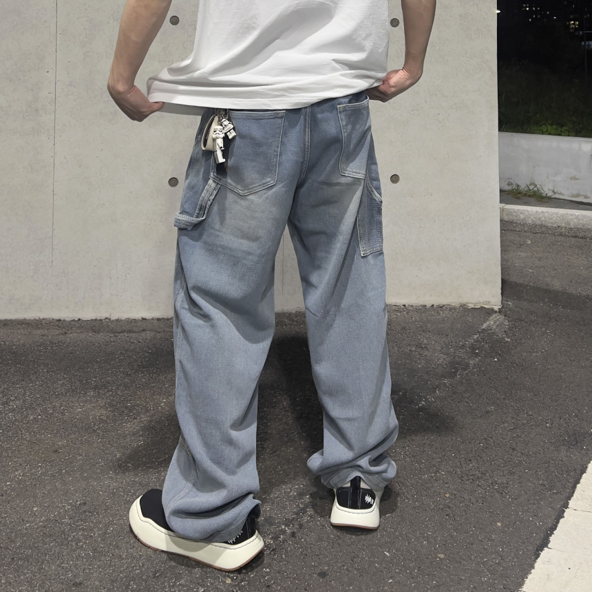 pants - sashiko double knee denim (blue) L 사이즈 착용 M 사이즈도 맞으나 조금 더 여유 있는 핏을 원하여 한 사이즈 업 한 피팅본입니다:)