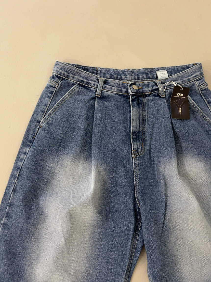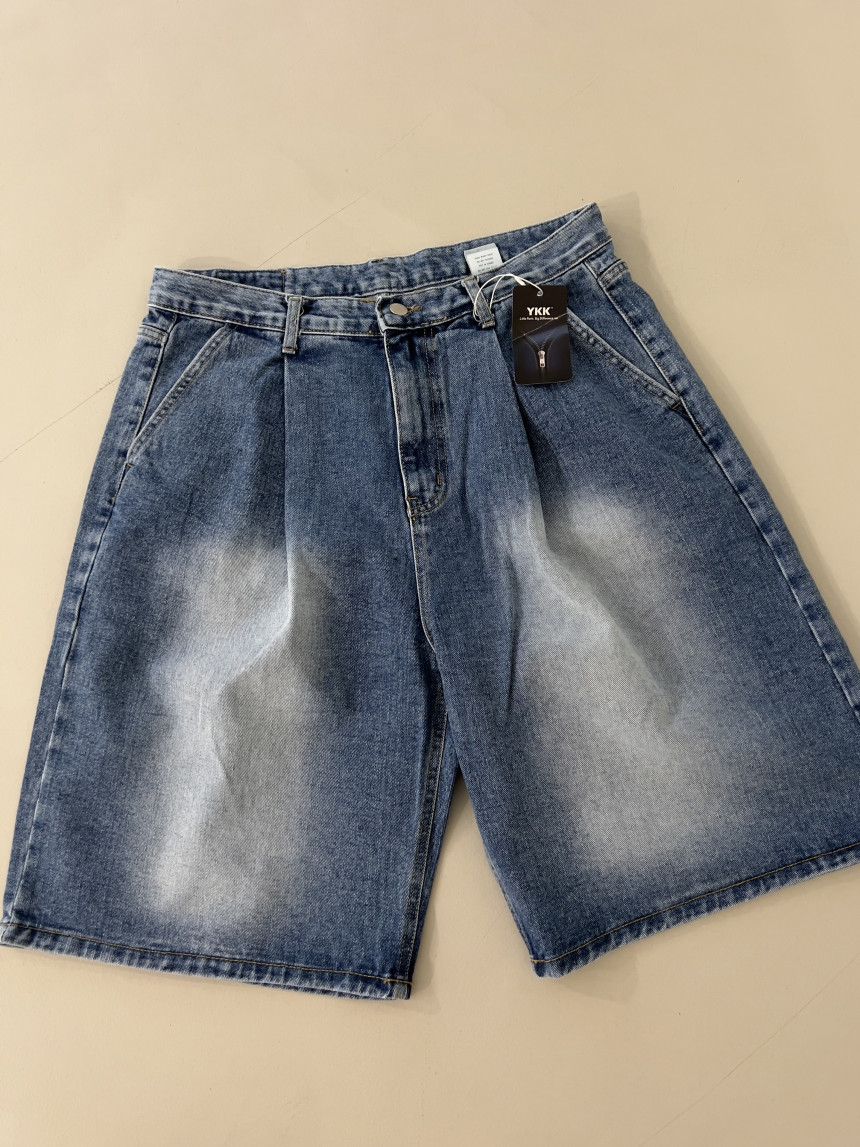 원턱 디테일의 와이드 데님 반바지 제품입니다.