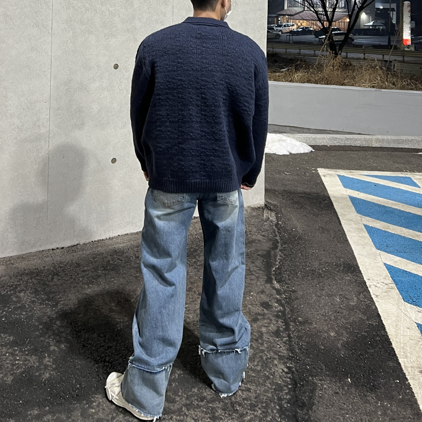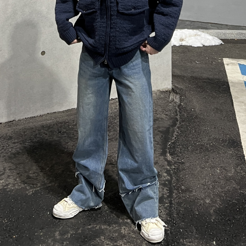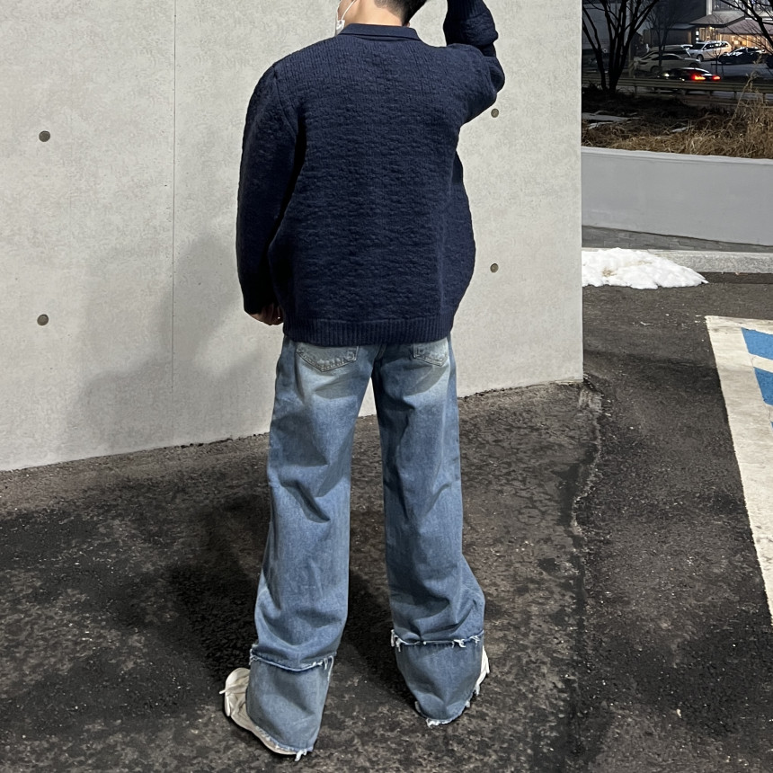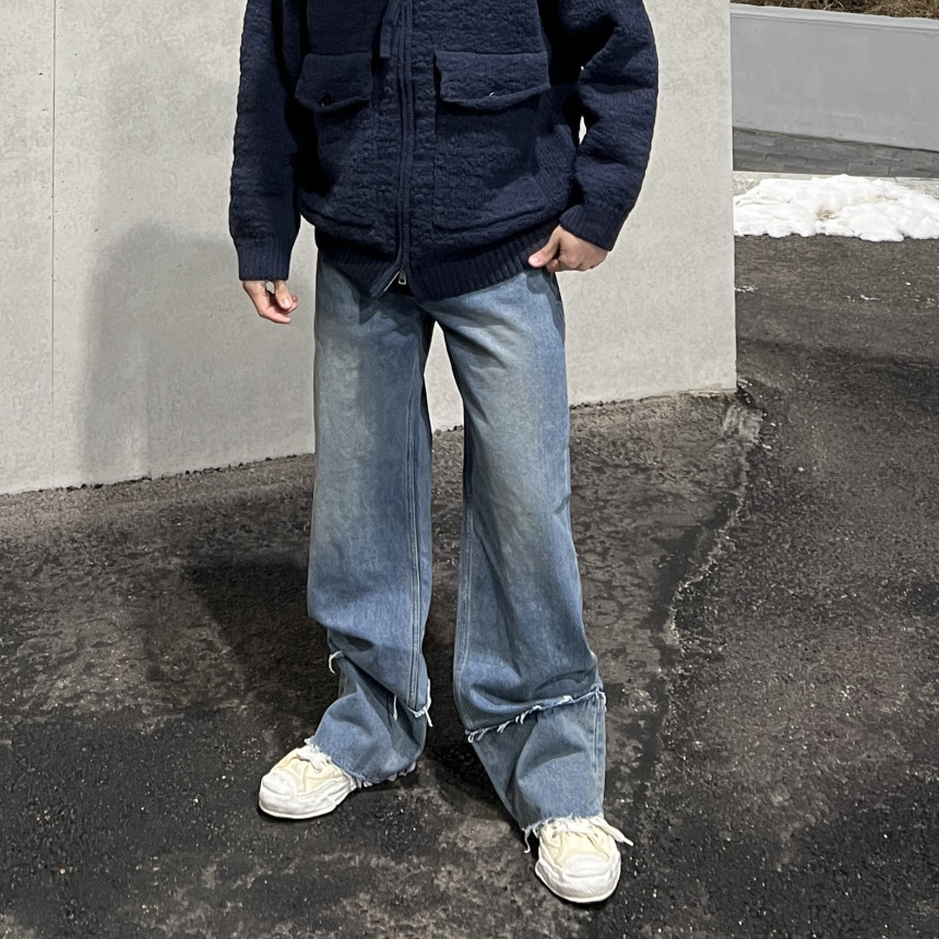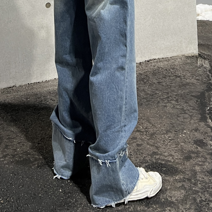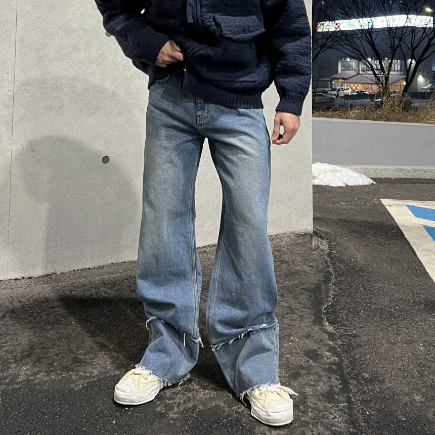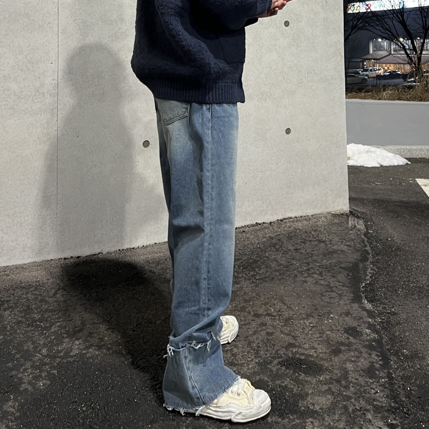 밑단을 커팅 해 위에 덧댐 봉재를 이어서 제작된 데님입니다.