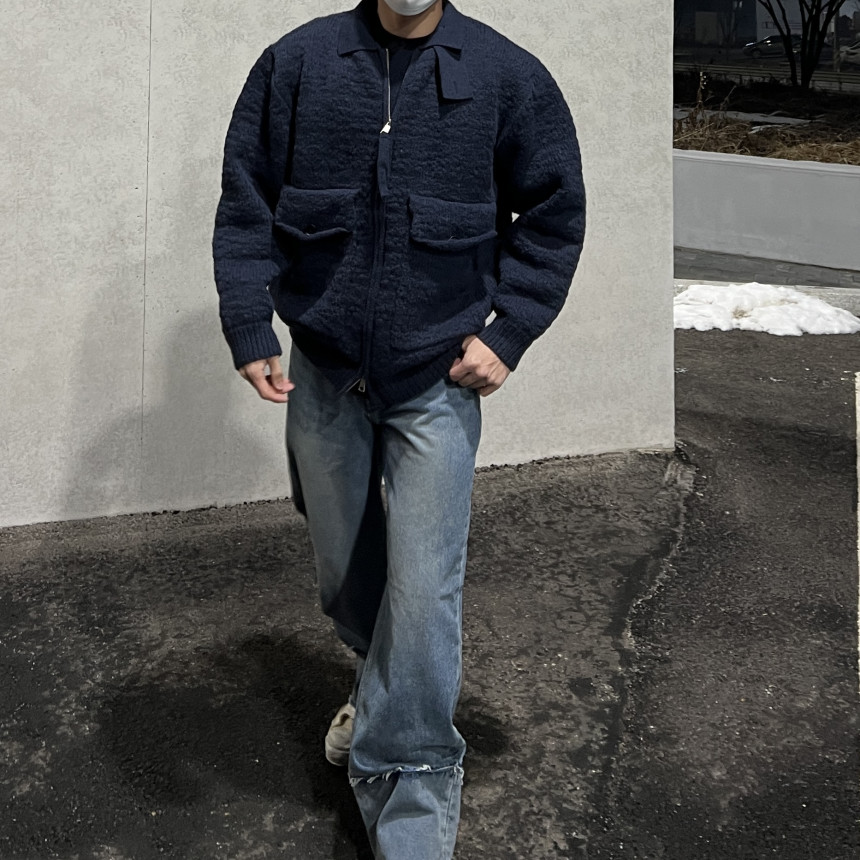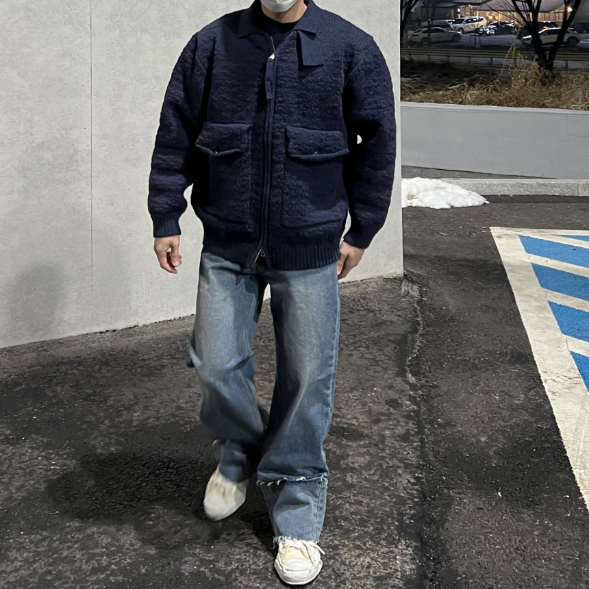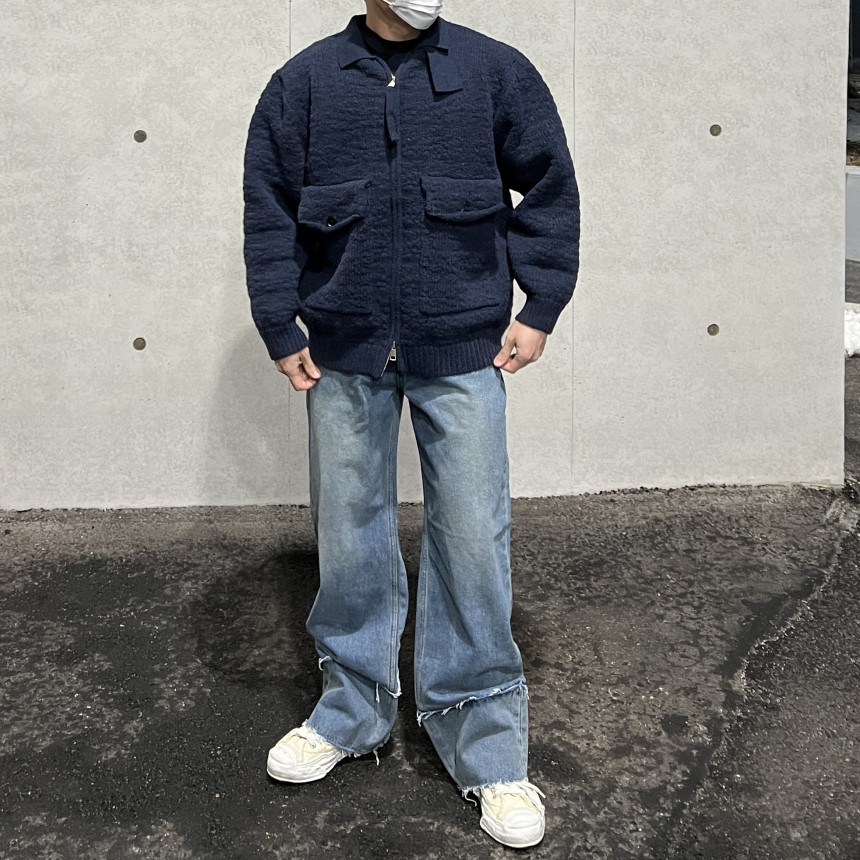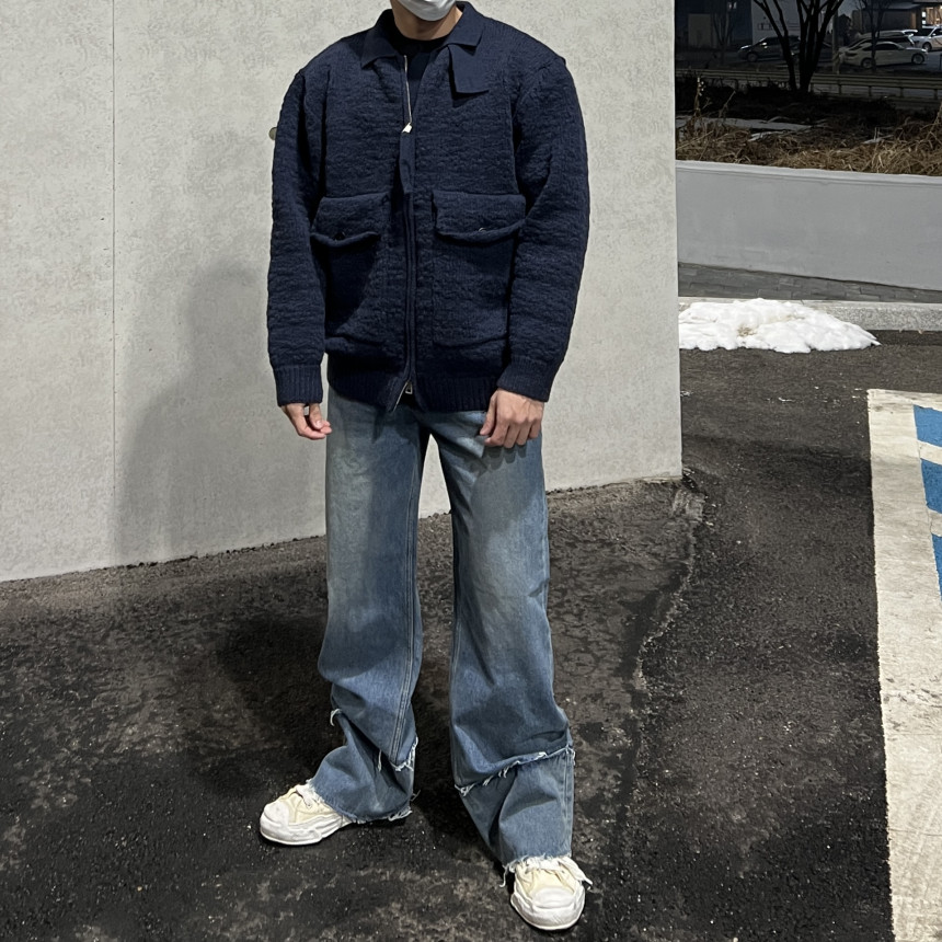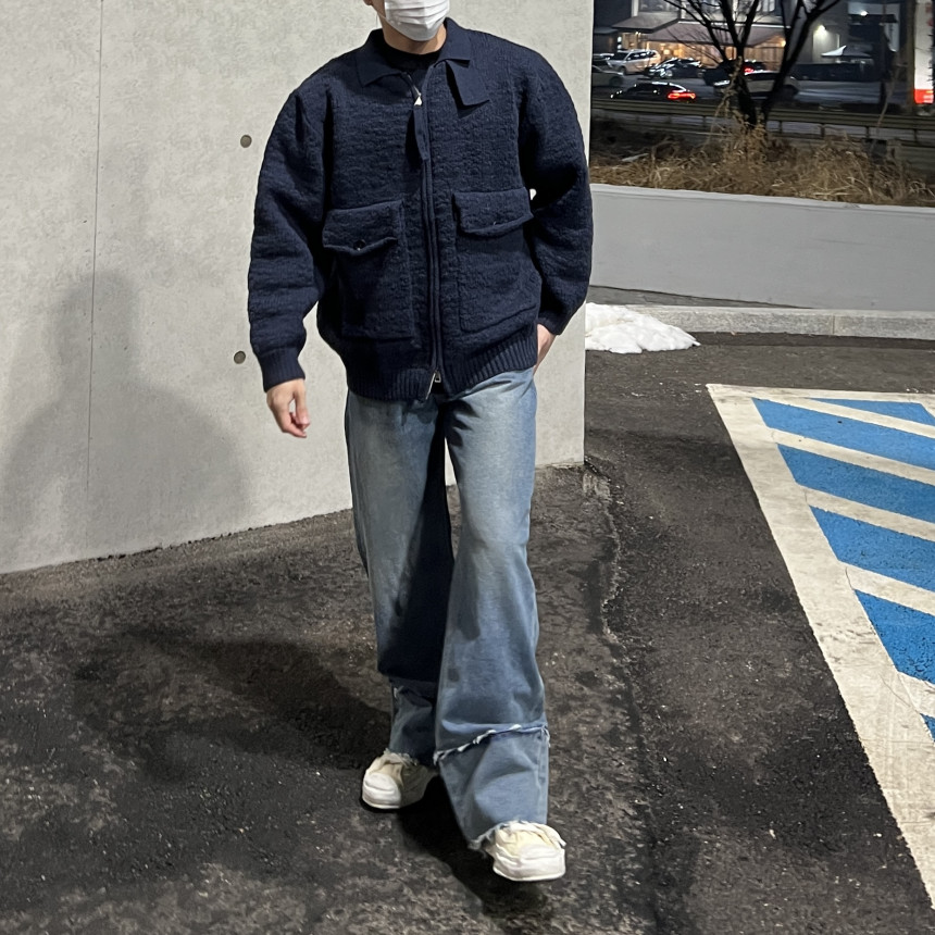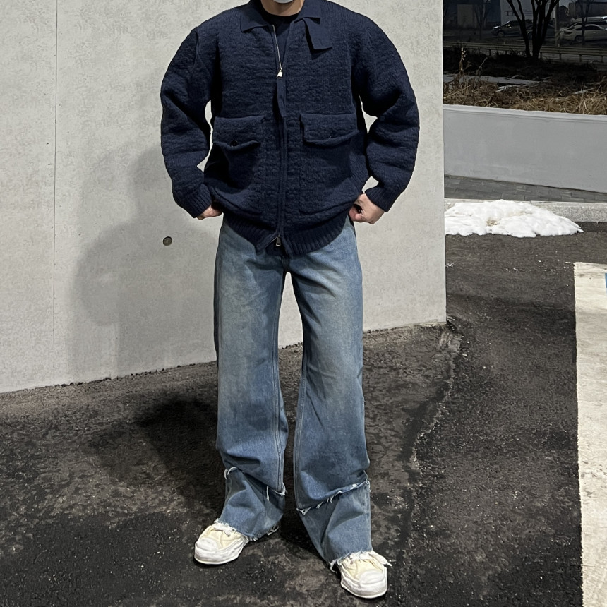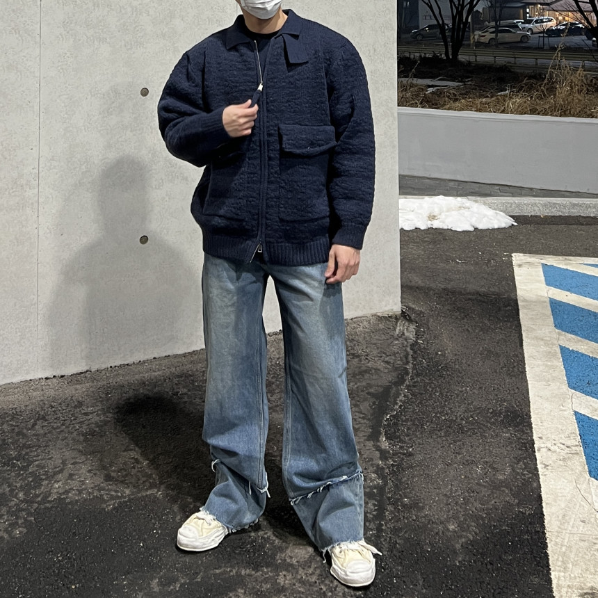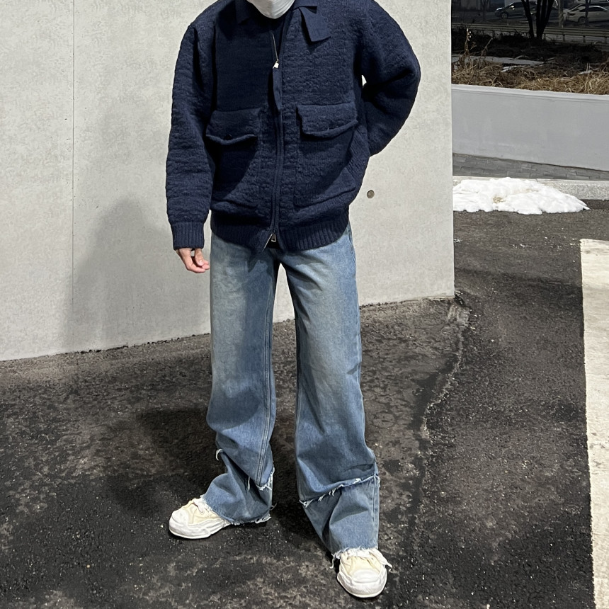 밑단을 커팅 해 위에 덧댐 봉재를 이어서 제작된 데님입니다.