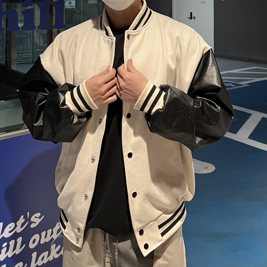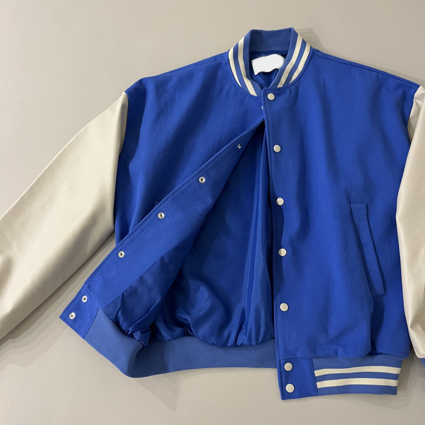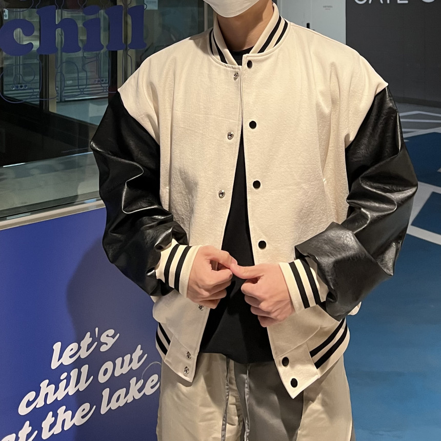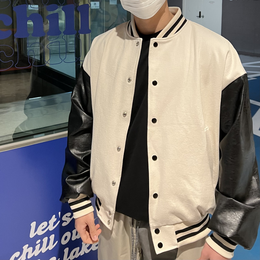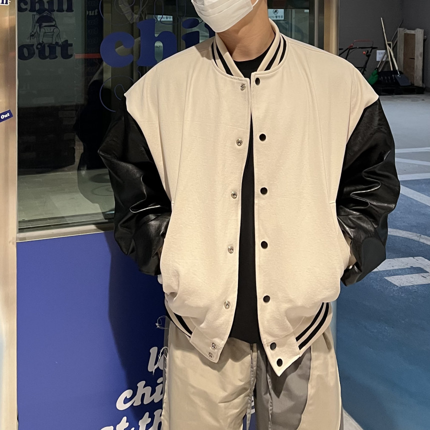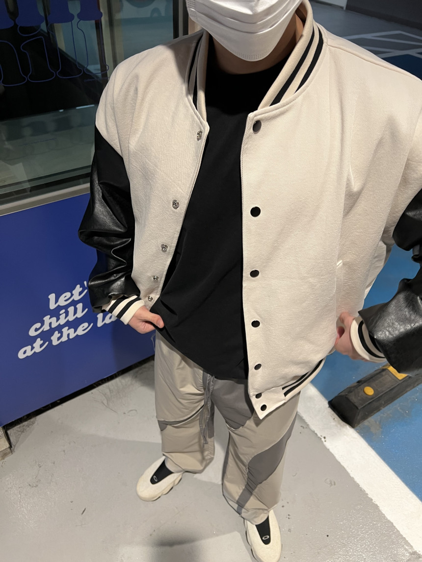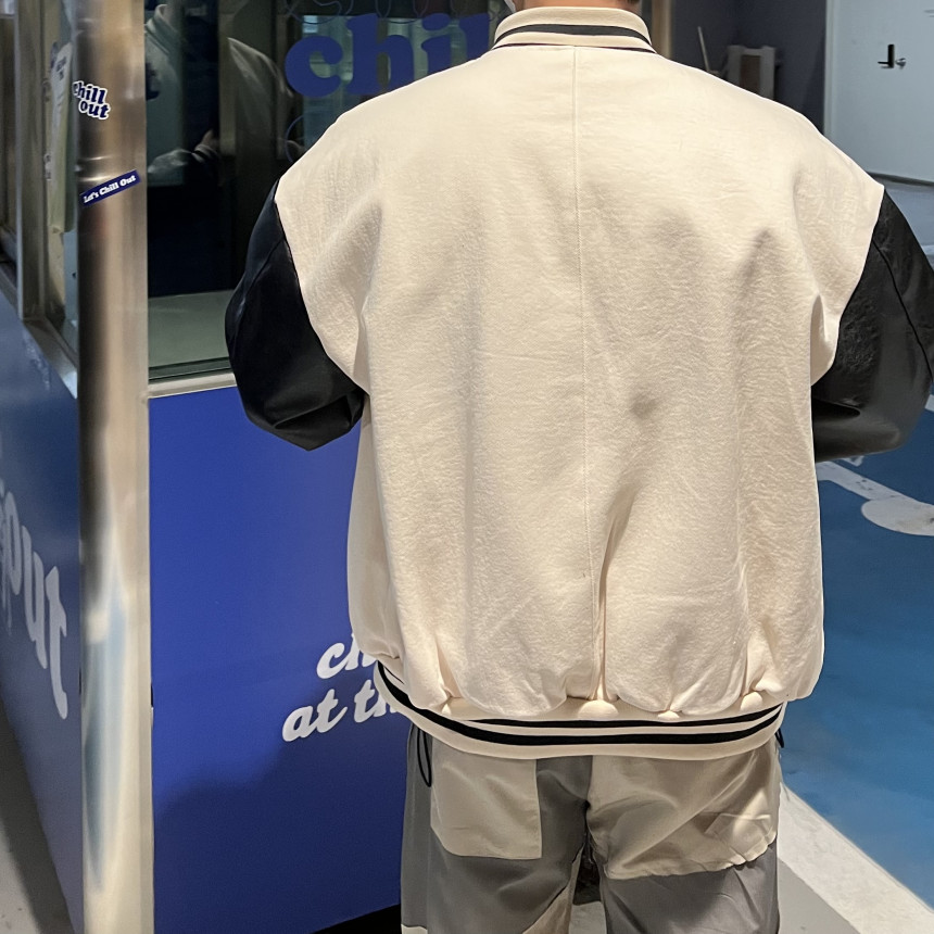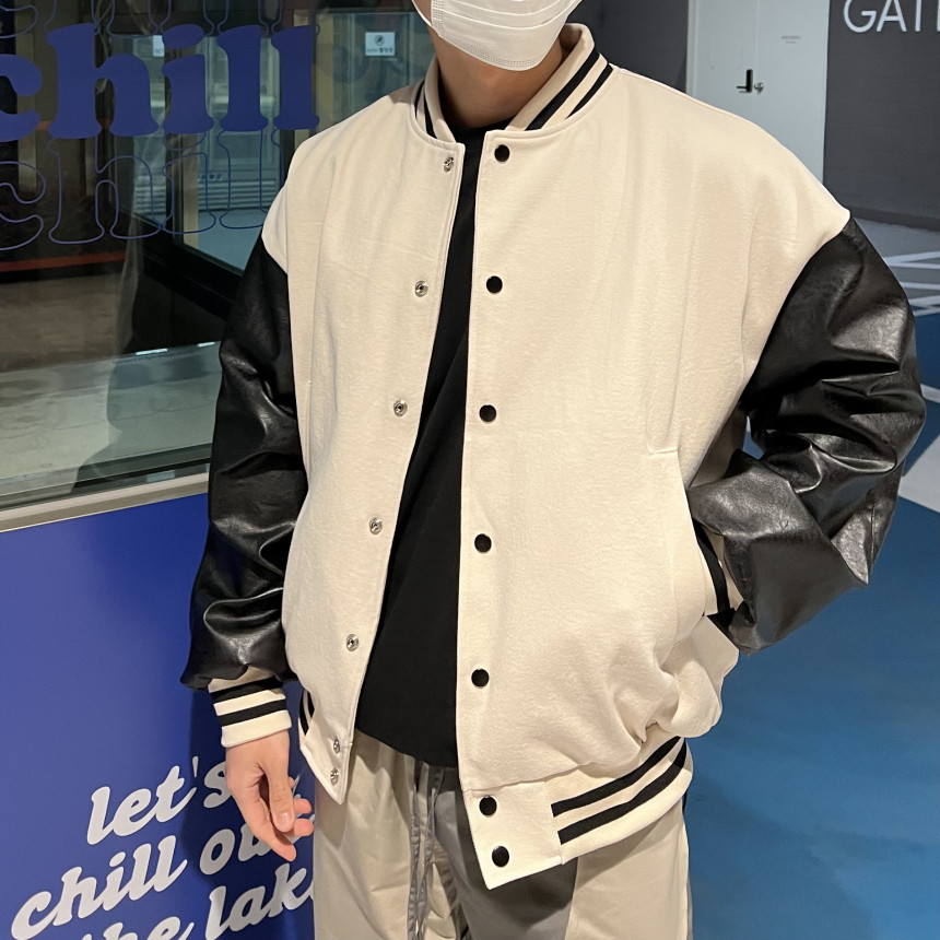 바시티 디자인의 팔 부분은 비건 레더 소재로