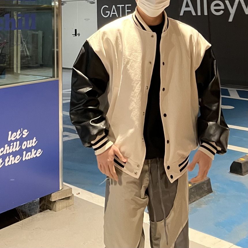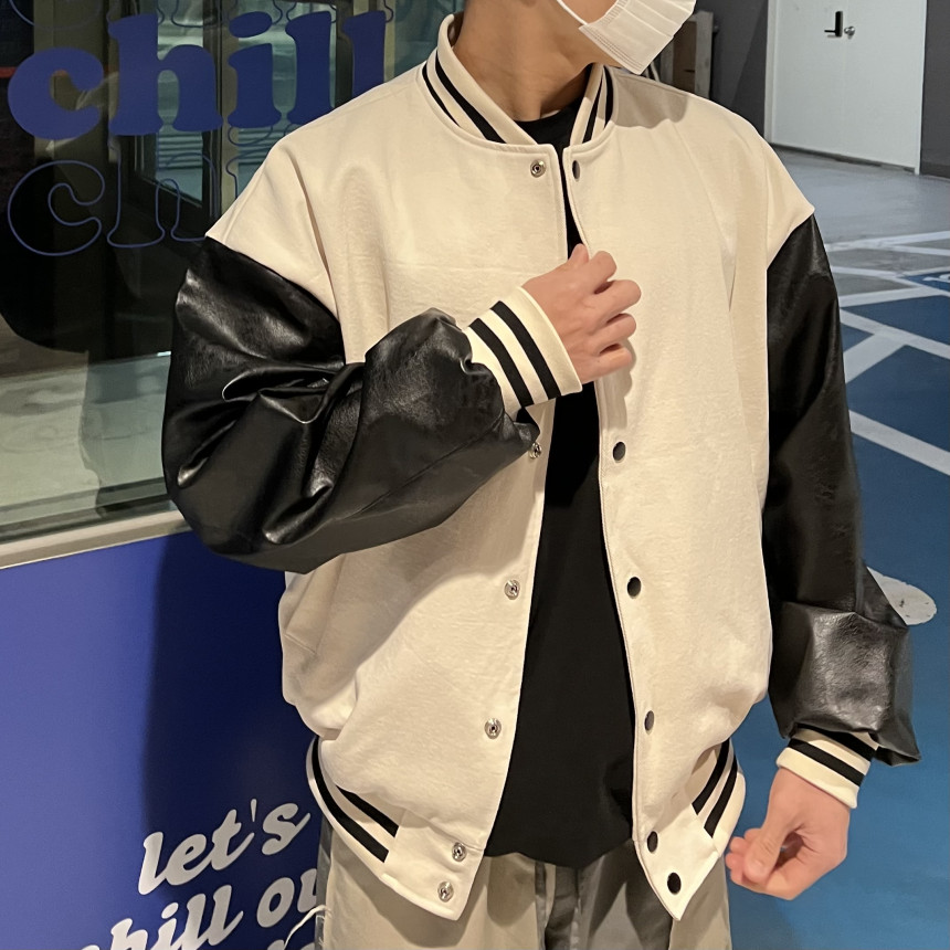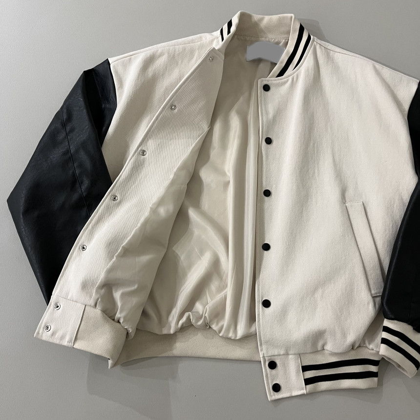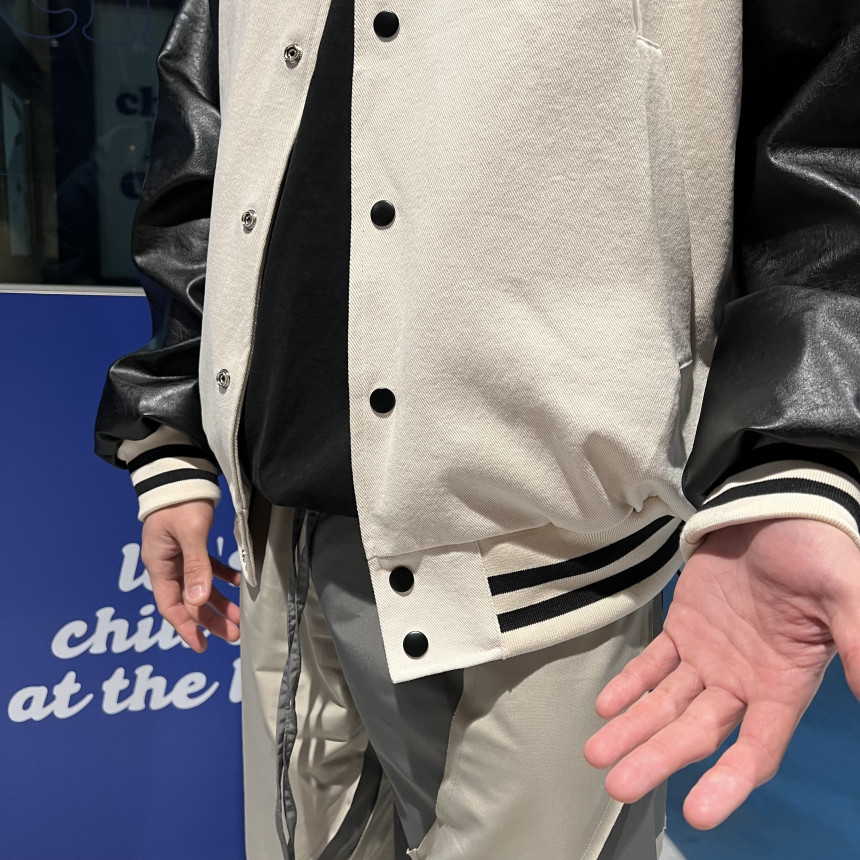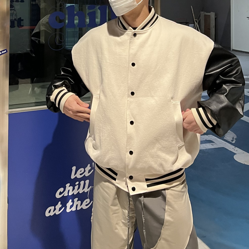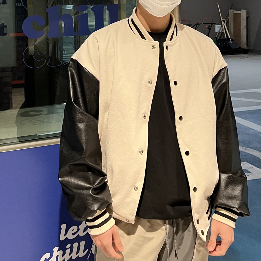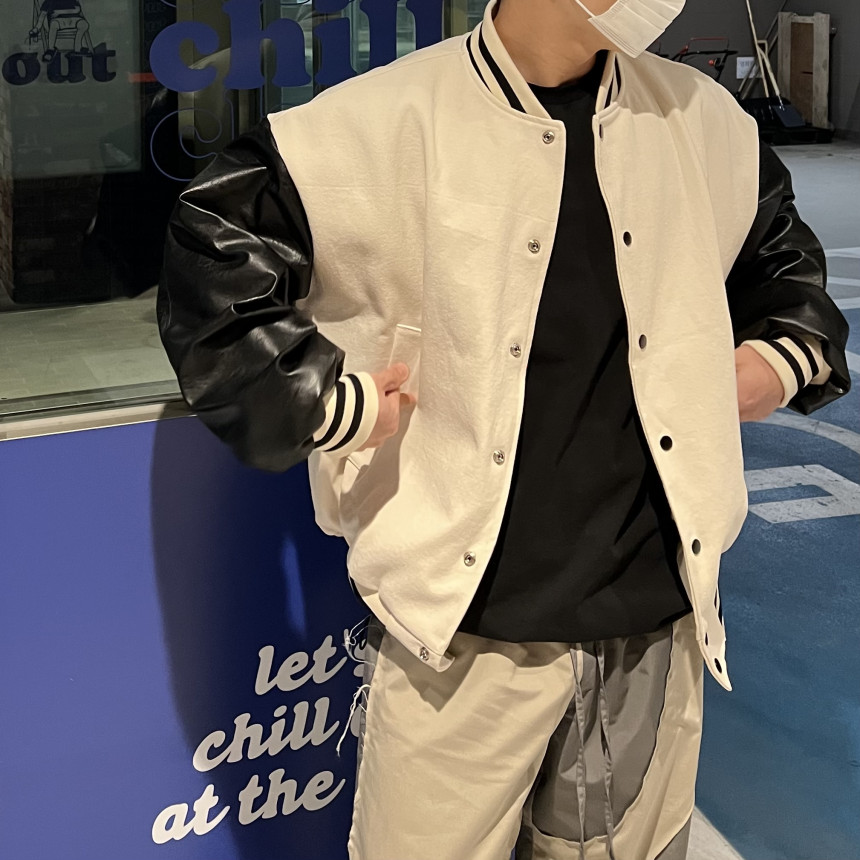 바시티 디자인의 팔 부분은 비건 레더 소재로