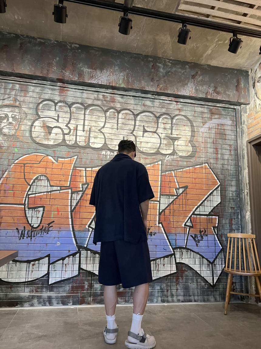 와이드 한 핏 감과 롱한 기장 (대략 6부), 전면 핀턱 디테일로 스트릿한 감성