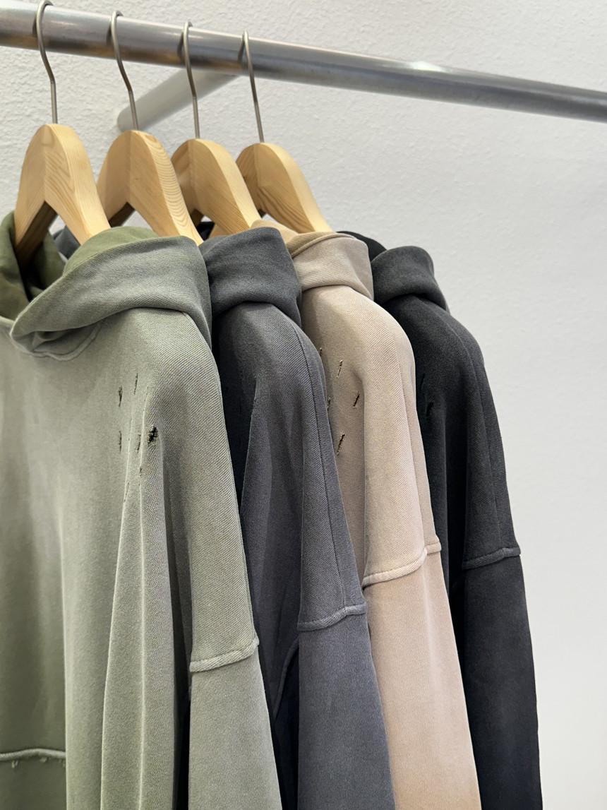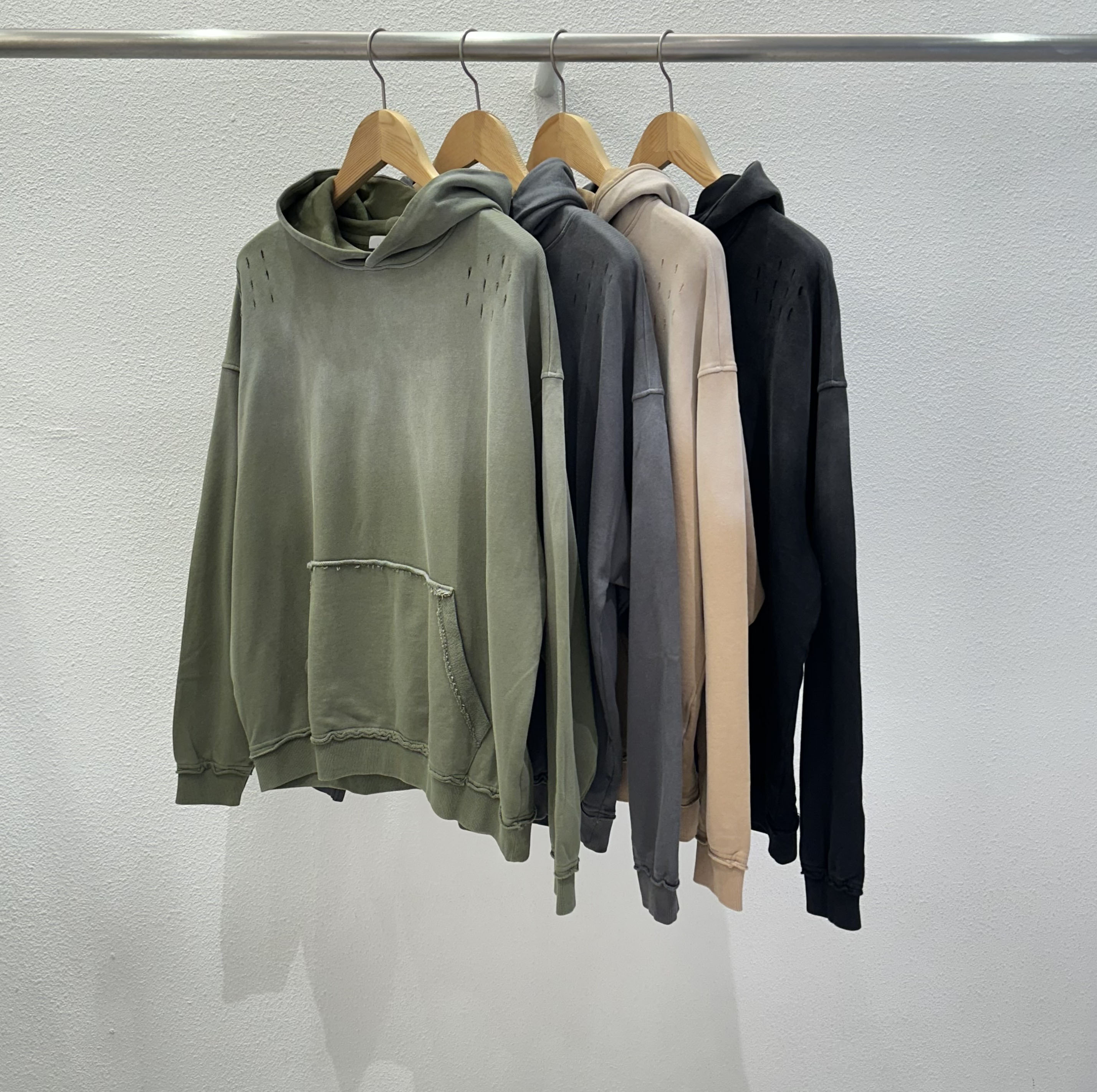 - 양쪽 어깨라인 데미지 디테일 / 전면 캥거루 포켓 리버스 디테일