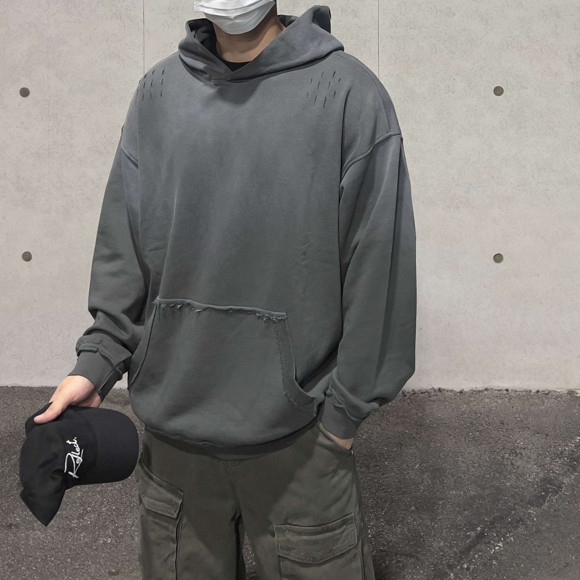- 양쪽 어깨라인 데미지 디테일 / 전면 캥거루 포켓 리버스 디테일