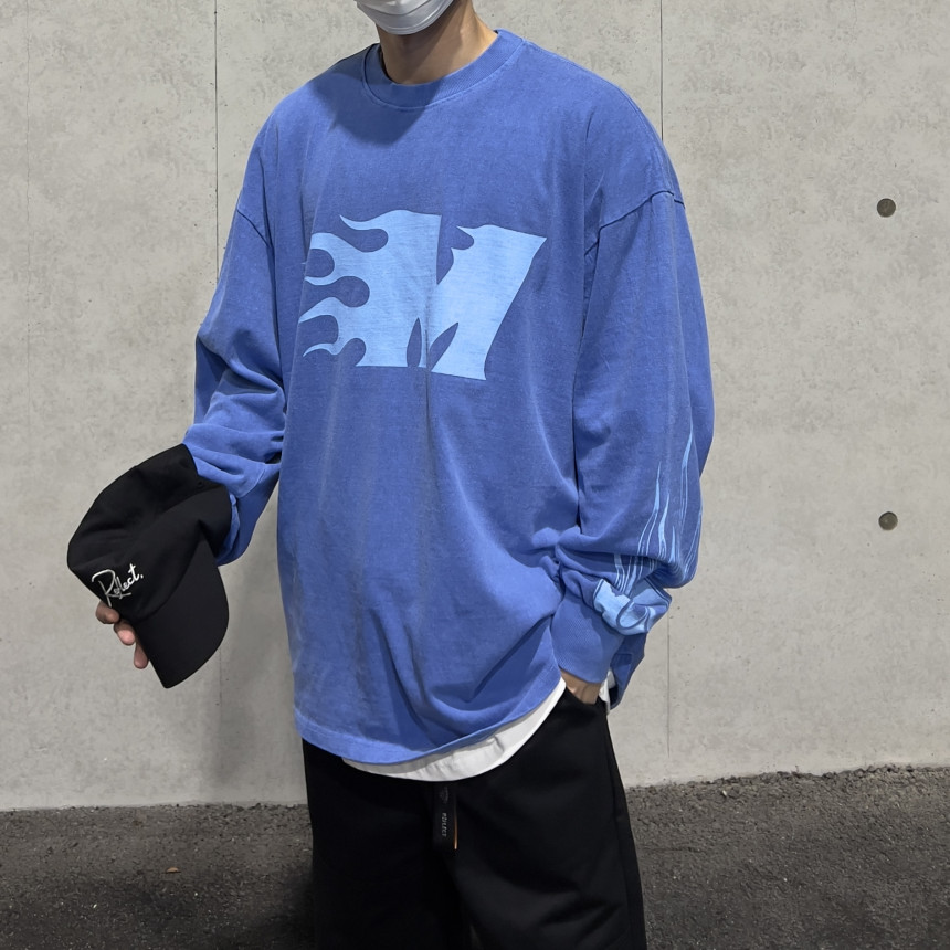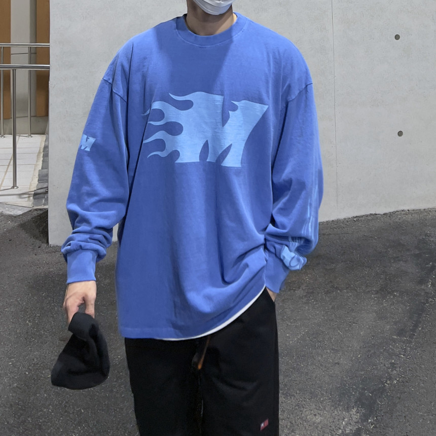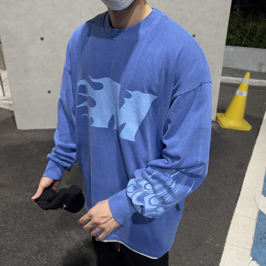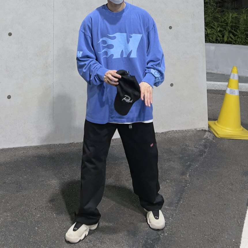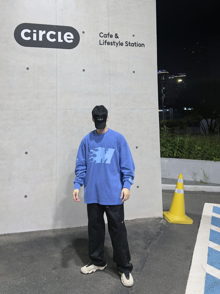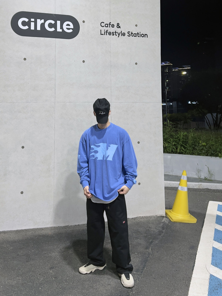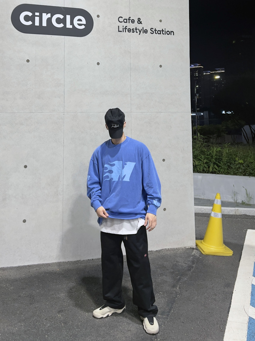 오버한 핏 감에 긴팔 티셔츠입니다.