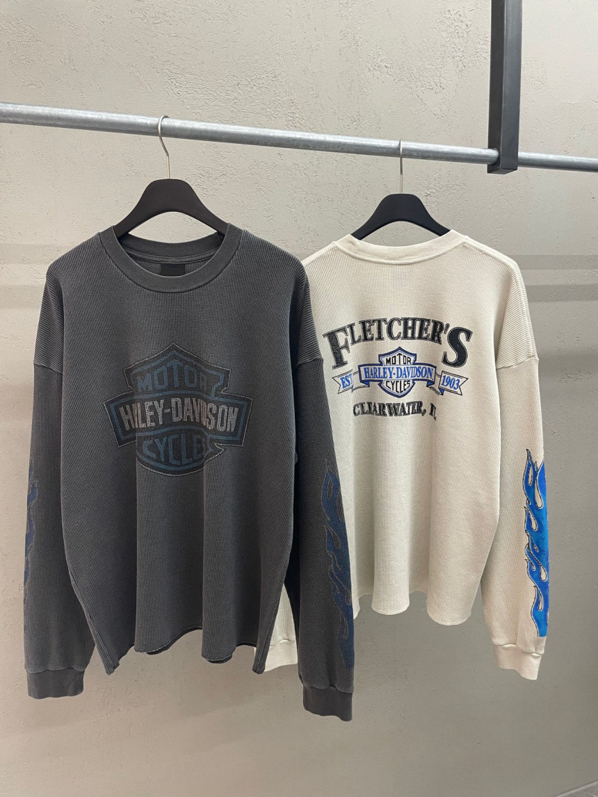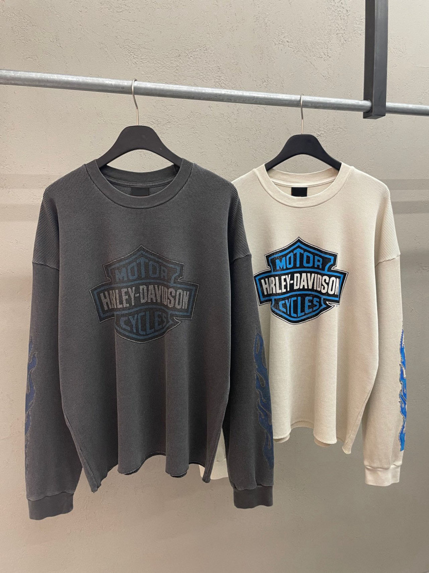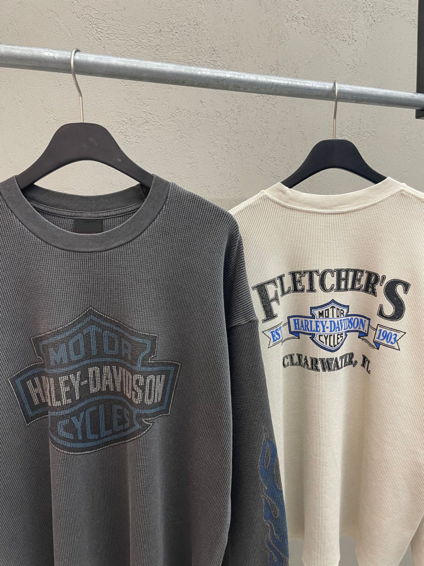 - 세미 크롭한 핏에 와플 소재, 드롭숄더 패턴의 긴팔 티셔츠 입니다.